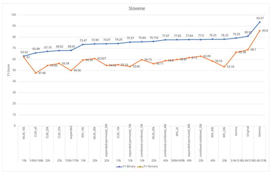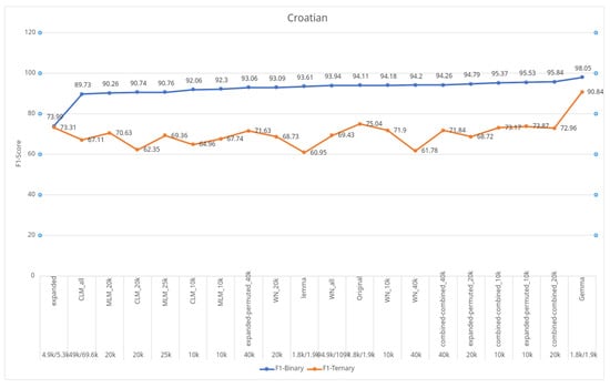 Each dataset for each of the four languages was required to undergo tokenisation, part of the speech extraction and lemmatisation. The Classla (https://github.com/clarinsi/classla, accessed on 26 July 2022) library was used for processing Bulgarian, Croatian, and Slovene, while the Stanza (https://stanfordnlp.github.io/stanza/, accessed on 26 July 2022) library was utilised for Slovak (https://huggingface.co/stanfordnlp/stanza-sk, accessed on 26 July 2022). We used the tokenised and lemmatised data to generate the lemmatised () and expanded () versions of the dataset. The expanded version was converted into Dataexpanded-combined and Dataexpanded-permuted by combining two individual sentences into a single training instance via sampling.