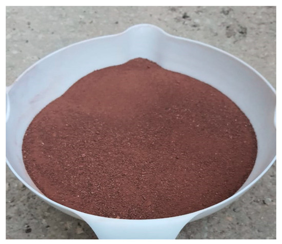 The materials used in preparing concrete mixtures in this research include crushed limestone, silica sand, white cement, locally quarried zeolitic tuff, tap water, seawater, and superplasticizers. Seawater was created in the laboratory by adding 35 g of non-iodized sea salt per liter of water to achieve a salinity of 3.5% that mimics the salinity of natural seawater. The maximum size of the coarse aggregate used was 20 mm. Two types of fine sand were used: crushed limestone and silica sand, in addition to ZT, which was added as a partial replacement for silica sand. The ground zeolitic tuffs have the same fineness modulus as silica sand, which is valued at 1.67. The source of ZT was a mine in Tafelah City, located in the south of Jordan. As shown in Figure 1, ZT has a reddish-brown color. The X-ray diffraction technique was used to identify and quantify the chemical composition of ZT, and it is presented in Table 1. The chemical composition of the used white cement and silica sand is also presented in Table 1.