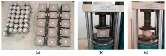 (a) Molded concrete specimens. (b) Compressive strength test. (c) Splitting tensile test.