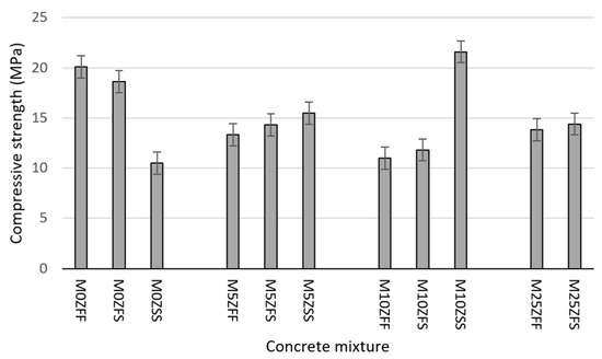 The mix proportions of the concrete were selected to obtain the optimum combination for the M20 grade of concrete according to ACI standards 211 [38], with a water-to-cement ratio of 0.69. This strength grade is commonly used in Jordan for the construction of several concrete structures. All mixtures in this experiment have the same cement content (275 kg/m3) and the same coarse aggregate content (1056 kg/m3). The incorporation of ZT in the concrete mixtures increases the demand for water because of the high porosity of the ZT and its platy microstructure [23]. Therefore, a dosage of superplasticizer was added to concrete mixtures to keep the workability constant, with a slump value ranging between 30 and 60 mm.
