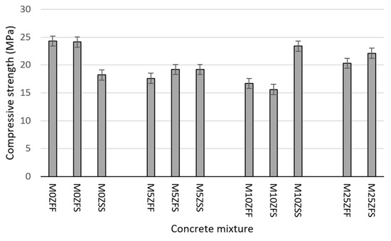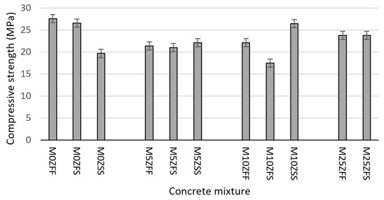 The strength of all concrete specimens showed a continuous strength development over the period of curing, as shown in Table 3, Table 4 and Table 5. The values in these tables are the average of the results from three specimens of each mixture. It can be seen that the desired grade of strength was achieved by obtaining a compressive strength of 24.31 MPa for the plain concrete M0ZFF. In general, incorporating ZT reduces the compressive strength of concrete specimens that were mixed with freshwater at all ages. Either these specimens were cured in freshwater, as seen in Table 3, or in seawater, as seen in Table 4. Similar findings have been reported by other research studies in the literature [23,42,43]. In this regard, Najimi et al. [23] have discussed the negative effect of natural zeolite on the compressive strength of concrete with high water-to-cement ratios. Chan and Ji [42] have found that using a water-to-cement ratio higher than 0.45 reduced the compressive strength of concrete containing natural zeolites, compared with control concrete without natural zeolite. Whereas, when the water-to-cement ratio is lower than 0.45, the obtained compressive strength is higher than that for control concrete. In another study, Ahmadi et al. [25] have reported an increase in the compressive strength of concrete containing natural zeolites with a water-to-cement ratio of 0.4 at curing ages of 3, 7, 28, and 90 days. However, when the water-to-cement ratio increased to 0.5, the compressive strength decreased at all ages [23]. Poon [43] investigated the impact of the water-to-cement ratio on the compressive strength of cement paste that contains natural zeolite. Their findings revealed that zeolites significantly enhance the strength of the paste, particularly when the water-to-cement ratio is low. It is worth noting that the least reduction in strength was in the specimens that contained 25% of ZT (M25ZFF and M25ZFS) as a partial replacement of silica sand, indicating the positive effect of incorporating higher amounts of ZT rather than 5%, 7.5%, and 10% percentages. For example, the compressive strength of M25ZFS decreased by 22.5% at the age of 7 days, which is comparted with M0ZFS, but it only decreased by 8.4% and 10.5% at the ages of 28 and 90 days of curing in seawater, respectively. The reduction in compressive strength at 90 days decreased as the percentage of ZT increased in the concrete mixture. This finding contradicts the results reported in [18]. As mentioned above, experimental results may differ significantly according to the type, structure, and purity of the used zeolite [23,24]. The improvement in compressive strength with increasing age can be attributed to the decrease in permeability, which is more significant at later ages due to the pozzolanic reaction of ZT [44,45,46].