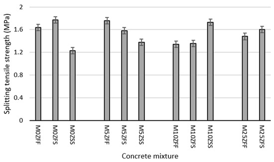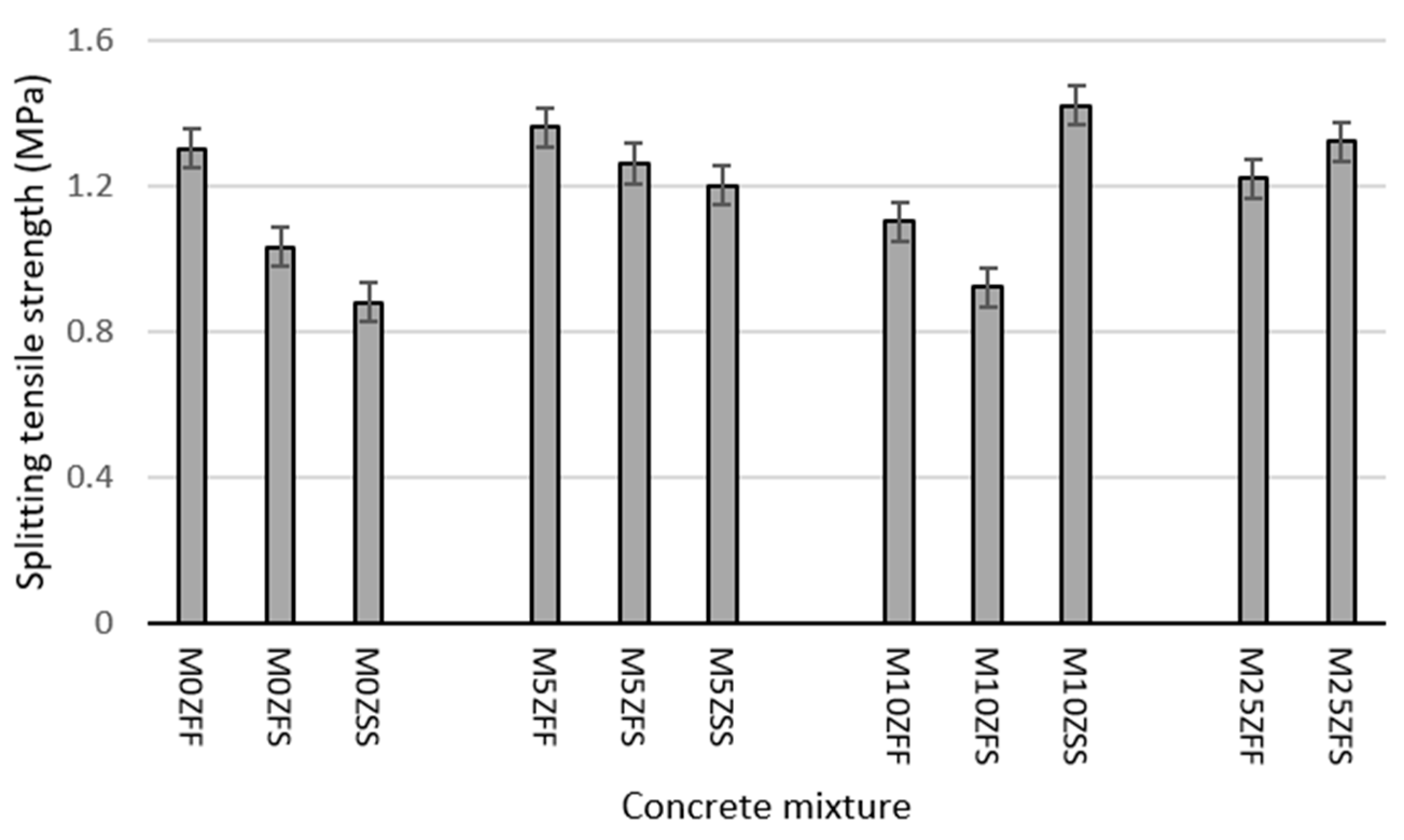 Table 3 shows that the splitting tensile strength of all specimens mixed and cured in freshwater and containing ZT is less than that for the reference specimens M0ZFF except M5ZFF, which showed an increase of 3.8% and 7.3% at 7 and 28 days, respectively. Whereas the specimens mixed with freshwater and cured in seawater shown in Table 4, an increase in splitting tensile strength at 7 days and a reduction at 28 days was observed, except M10ZFS, which showed a 10.6% and 23.6% reduction in splitting tensile strength at 7 and 28 days respectively.