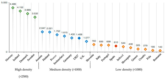 Readers can notice the difference between Norway (highest level) and Romania (lowest level), with a factor of 30 in the charging point density. On the other hand, countries in the high-density range—Norway, Iceland, Denmark, and Sweden—only represent 0.65% of the total number of charging points in the European Union, since the population density in these countries is very low, reinforcing the need to implement a dense electric vehicle charging station network to compete with fossil fuel engine cars.