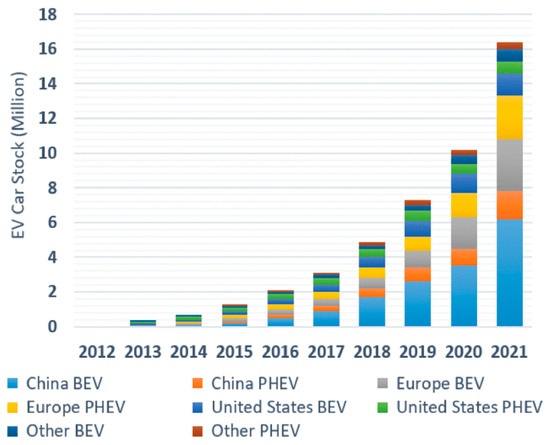 Despite the many obstacles to implementing electric vehicles in modern society, the number of cars powered by electricity is continuously growing, as shown in Figure 2. This situation generates a conflict because the number of charging stations is not growing at the same rate as electric vehicle sales.