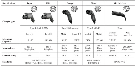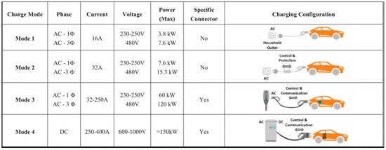An electric vehicle charging point is characterized by the charging rate, the charging mode, and the charging connector. The charging rate is regulated by the norms SAE J1772 [21,22] and IEC 61851-1 [23]; the former includes three types of rate and the latter four types. Table 1 shows the specifications of the different charging rates depending on the power supply.
