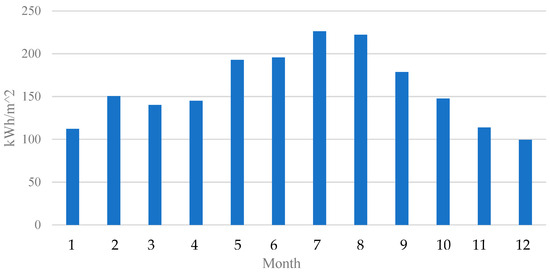 Photovoltaic power plant location is selected from the solar radiation database provided by the Geographical Information System (GIS) from the European Commission Service for Photovoltaic Systems (PVGIS) [33]. The selection criteria are based on maximizing the monthly average solar radiation on site; following these criteria, the photovoltaic array is oriented to the equator and tilted 35°. Figure 6 shows the monthly solar radiation distribution in the selected location (Madrid, Spain).
