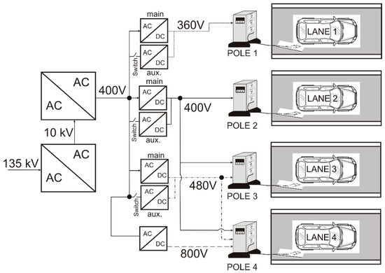 The basic design of the charging station includes four charging poles with four sockets for each pole. Figure 8 shows the voltage supply for each pole and socket.