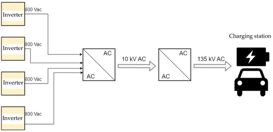 Based on data for a single charging pole, shown in the Energy Demand section, and considering the charging station layout from Figure 9, the prototype requires a global power of 1776 kW, corresponding to four charging poles of 444 kW each. On the other hand, if we transport this power at the 400 VDC corresponding to the PV array output voltage, as described in a previous section, the energy losses are enormous; indeed, for every kilometer of transmission line from the PV power plant to the charging station, operating under these values, we have the following power losses: