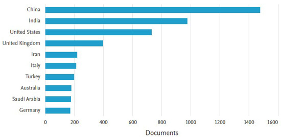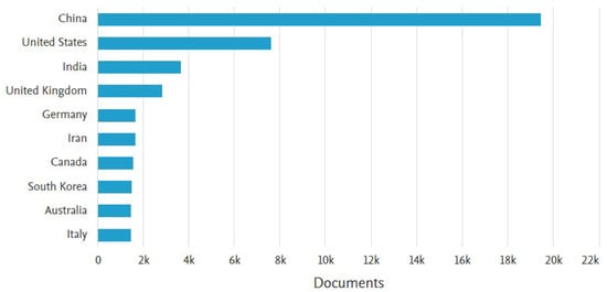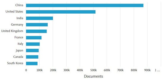 Although research into aircraft structure optimization using NN is more recent, as can be seen in Figure 1, it shows a notable growth trajectory. This growth is indicative of the growing interest and recognition of the potential benefits that NNs offer in optimizing aircraft structures. On the other hand, research into aircraft structural optimization in a general context has a longer history, dating back to 1918, as can be seen in Figure 2. This longer period reflects the traditional structural optimization approaches that have been employed over the years. Despite the recent emergence of NNs in this field, there continues to be a significant body of research conducted without the use of this tool. Furthermore, when analyzing the number of documents on optimization in both cases, two countries, China and the United States, emerge as the main contributors, as can be seen in Figure 3 and Figure 4. This could highlight the global interest and involvement in the optimization of structures, regardless of the methodologies employed.