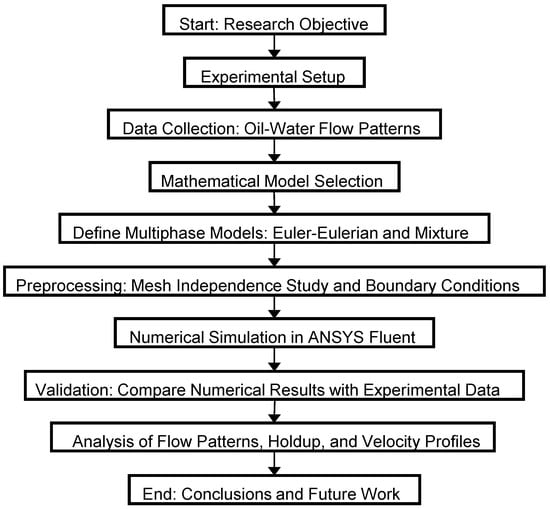 The development of the model consists of three fundamental parts. The first part involves the experimental setup, which is used to capture oil–water flow patterns and obtain data for model validation. The second part focuses on the evaluation and choice of the most suitable mathematical models to predict different flow patterns. Finally, the preprocessing, definition, and implementation of the numerical simulation are performed. The validation of the model is carried out by comparing the numerical results with experimental observations of oil–water flow patterns. Figure 1 presents the flowchart describing the methodology used.