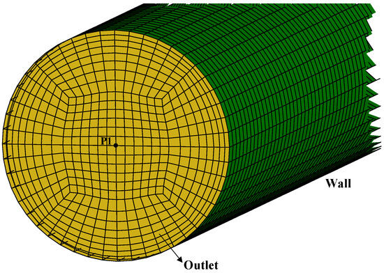 For the mesh, an O–H structured mesh is used in the input section and extended along the pipe length. The mesh consists entirely of hexahedral elements, with a slight refinement near the wall to capture boundary layer effects, as shown in Figure 3.