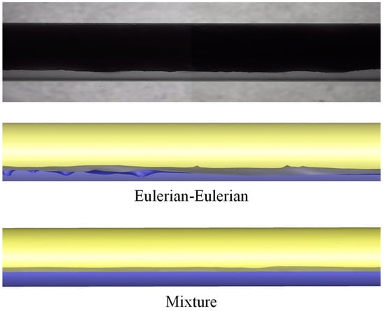The three-dimensional visualization of simulated patterns is performed in the final section of the model pipe, capturing the interface through volume fraction iso-surfaces. According to the numerical model of the flow conditions implemented in experiment 1, shown in Figure 4, in both the mixture model and the Eulerian–Eulerian model, a stratified flow development similar to that developed experimentally is observed, with the difference that the Eulerian–Eulerian model generates more disturbances on the surface of the interface, more closely resembling the small waves observed experimentally. Something important to highlight from this experiment is that, despite the volumetric flows of both fluids being very similar, the oil shows some stagnation due to its high viscosity compared to water. Therefore, an increase in the area occupied by oil is observed, which could also be observed in the respective models.