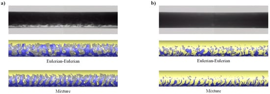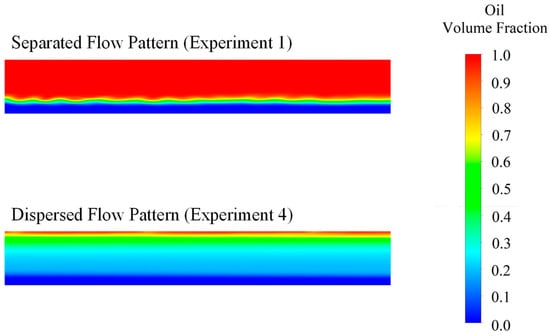 Figure 8 shows the experimental and numerical results of the cases of dispersion of oil in water, observed in experiments 4 and 5, in which some differences can be noted when using the mixture model, especially in experiment 4, since the flow pattern obtained using this model seems to be stratified with mixing in the interface (ST & MI) with little oil dispersion, contrary to the experimental pattern. On the other hand, the Eulerian–Eulerian model seems to accurately represent the patterns in both cases, noting the dispersion of oil droplets in the aqueous medium and emulating their tendency to concentrate in the upper part of the pipe.