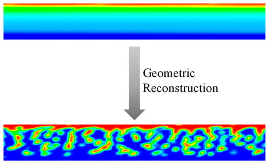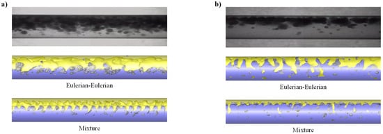 Youngs’ geometric reconstruction scheme is a useful method to achieve more accurate interface tracking, forcing an explicit separation of the phases within the control volumes according to the cell volume fraction and the fluxes to neighboring cells [47]. In this way, using this scheme as a final treatment in dispersed flows facilitates the visualization of the droplets as they are distinguished in the experimental captures. Figure 6 shows the difference in phase separation when using the geometric reconstruction scheme in the simulated dispersed pattern under the conditions of experiment 4.