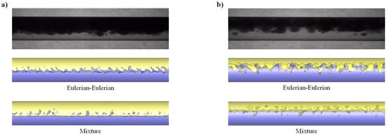 The mixture model, while computationally less demanding, exhibited limitations in accurately predicting flow patterns with high levels of dispersion. This is likely due to the model’s inability to resolve interfacial dynamics as effectively as the Eulerian–Eulerian approach. In dispersed flow regimes, the droplet sizes inferred from the simulations were constrained by the critical Weber number assumption and the mesh resolution. These findings suggest that incorporating more advanced interfacial force models and adaptive mesh refinement techniques could improve the prediction of droplet behavior and phase interactions.