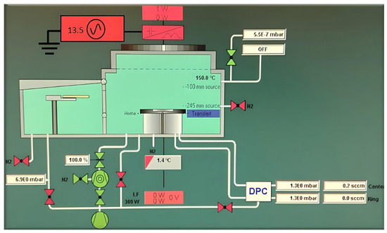 According to the literature, the field of nanotechnology has recently evolved exponentially to achieve higher resolutions at the nanoscale using different methods and techniques. Recent developments in nanotechnology, particularly lithography, have enabled the creation of nanoscale features with unprecedented precision. Lithography methods are being developed to transfer even smaller features into substrates [4]. Techniques such as Extreme Ultraviolet Lithography (EUV) [31], Electron Beam Lithography (EBL) [31,32], and Nano Imprint Lithography (NIL) [33], combined with precise thin-film deposition methods, facilitate the fabrication of microelectronic devices at the nanometer scale. Many of these structures, produced using methods such as vapor–liquid–solid (VLS) growth or wet-chemical catalytic etching, are commonly referred to as “silicon nanowires”, whereas structures created through dry etching are typically known as “black silicon” [19,20]. With advancements in these processes, etching techniques such as Inductively Coupled Plasma Reactive Ion Etching (ICP RIE) have also evolved, becoming essential for the precise construction and control of multilayer patterns [34]. Additionally, the ICP RIE technique was employed to fabricate black silicon nanostructures for solar cell applications. Based on different attempts at nanostructure formation, the etching method offers several advantages, including precise nanostructuring, low reflectivity levels in the 400–700 nm spectral range, the ability to produce a variety of surface textures, and improved photovoltaic conversion efficiencies. Additionally, ICP RIE enhances the long-term stability of solar cells and reduces recombination losses, contributing to improvements in overall performance efficiencies. Based on these findings, the plasma etching method was chosen for its speed, precision, and superior controllability compared to conventional grating techniques [35]. Utilizing reactive species generated in plasma via a radio frequency (RF) electric field, this method enables the controlled formation of nanostructures with specific shapes and dimensions.