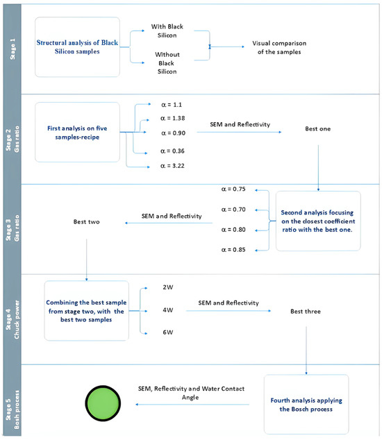 In the fabrication process of b-SI, a range of devices were employed for sample handling, inspection, and data acquisition. Key tools included an SEM and an ICP RIE system. Additionally, WCA measurements were conducted to evaluate the hydrophobicity of the black silicon surface, including samples processed using the Bosch technique [36,37,38,39,40]. All ICP RIE plasma etching procedures were carried out in a Class 100 cleanroom environment, utilizing appropriate chemicals and tools to minimize contamination risks [39,41]. Nanostructural analysis of the fabricated samples was subsequently performed using SEM. Afterward, spectrometric analysis was conducted outside the cleanroom environment to measure reflectivity and absorption. Figure 2 provides an overview of the experimental setup stages used in the fabrication of black silicon.