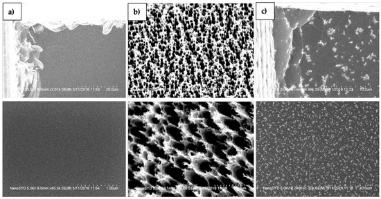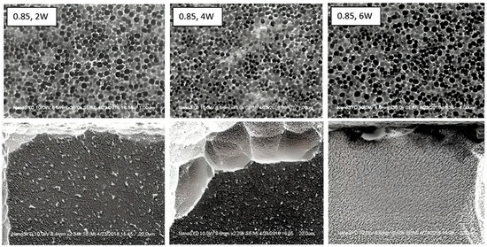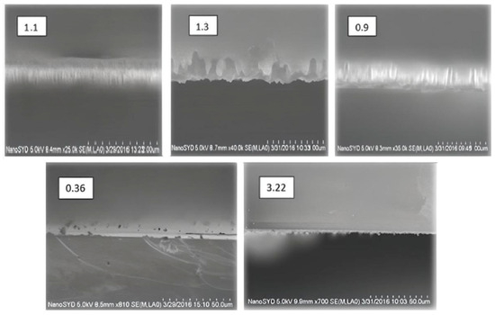 Based on the top-view SEM images, the best samples, with a gas ratio of α = 0.9, exhibited more regular structures, and the hole shapes were more circular. After analyzing the top-view images based on the criteria of regularity, size, and shape, a similar assessment was conducted on the side-view images, which were obtained after cutting the samples with a diamond tip. The sample with α = 0.9 proved to be the best in terms of structural regularity. For further details, the side-view images of all five samples are shown in Figure 6.