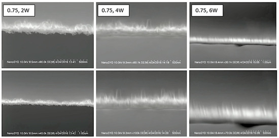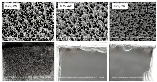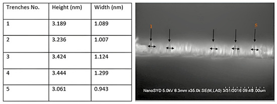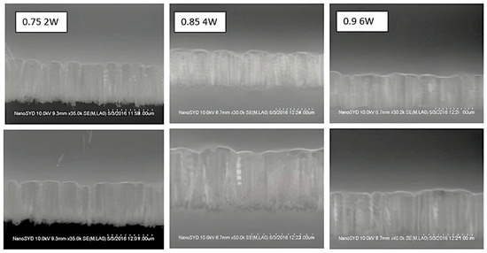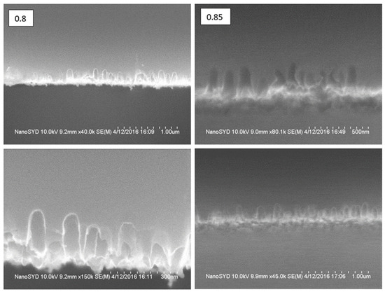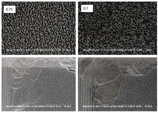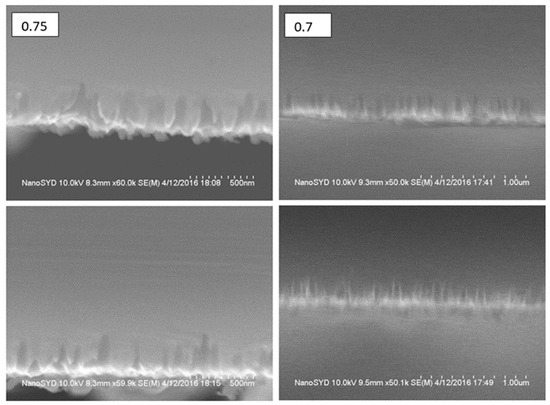 Figure 11 shows the SEM images taken from the sides of the samples with lower ratios of α = 0.75 and α = 0.7. The difference in size between the pillars was very small. Furthermore, it was quite hard to determine which one had the lowest reflectivity rate.