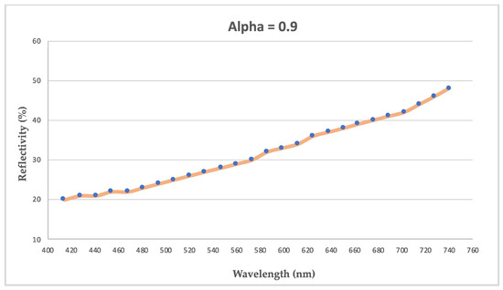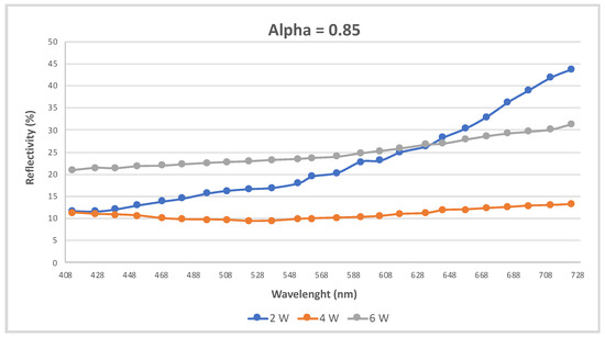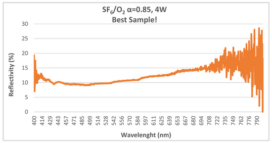 Based on the reflectivity data, the best samples with the lowest reflectivity were those with α = 0.75 and a chuck bias of 2 W, showing a reflection value of about 19% in the 400–500 nm range. The second best sample, as shown in Figure 19, was the one with α = 0.85 and a chuck bias of 4 W, which achieved a reflectivity value around 10% in the 400–600 nm range, making it the selected sample. This sample demonstrated significantly lower reflectivity compared to the sample from the first set. Notably, both graphs show an improvement in light absorption after activating the chuck bias power.
