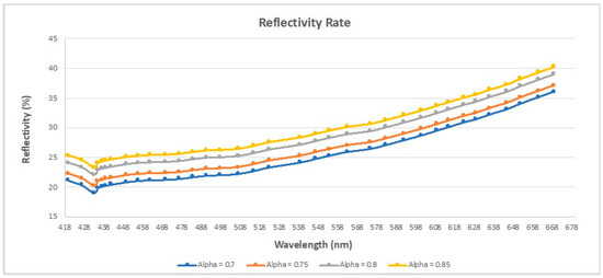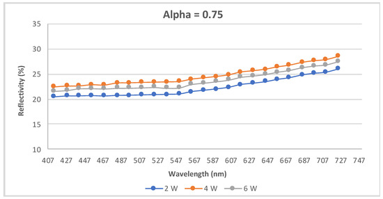 Through the SEM image analysis, it was challenging to directly observe the variation in the reflectivity rates between the samples. However, the data obtained from the reflectivity tests clearly demonstrate a linear relationship for reflectivity across the wavelength range of 400–700 nm for each sample. The sample with α = 0.75 and a chuck bias of 2 W exhibited the lowest reflectivity. The behavior of all three samples was consistent within the 400–700 nm wavelength range, and considering that the spectrometer’s range spanned from 165 to 1100 nm, this stability in reflectivity is desirable, especially at lower reflectivity levels. Achieving such stability supports the goal of improving the reflectivity performance of black silicon.