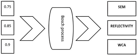 The Bosch process was applied after the best samples were chosen from the recipes with α = 0.75; 0.85; and 0.9. Then, the next steps were to test the results from the etching process in the ICP RIE machine with SEM and a reflectivity test. Another testing step, water contact angle (WCA) testing, was introduced to measure the hydrophobicity of the surfaces.