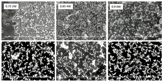 From the acquired SEM images, it is evident that in both cases the microstructure that was created (between the ‘holes’) was spread across the sample with the same density, and the size was roughly the same in all regions. For the sample with α = 0.75, the structures were more regular and deeper, whereas in the right image of the sample with α = 0.7 the microstructures were poorer and not sharp. To compare these samples with the two other samples, another set of SEM images was taken, as shown in Figure 10. They were subjected to a reflectivity test, and combining both SEM and reflectivity data gave a better indication of which sample was best.