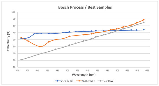 In the opposite case, there was a high amount of SF6 gas, which led to a situation where the passivation layer was not able to provide the micro masks necessary to form black silicon. For these reasons, the right equilibrium was theoretically easy to calculate, but in practice it was difficult to control, and it was difficult to understand the real variables acting during the etching process. At this stage, the reflectivity levels were quite close, as were the gas ratios (see Figure 14). All these considerations required analysis to choose the second-stage gas ratios to use for the next samples.