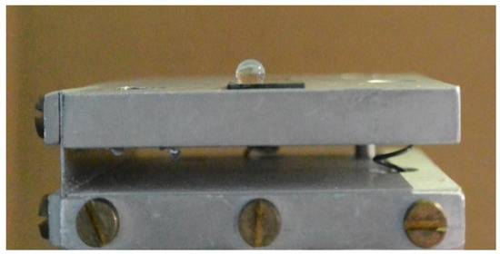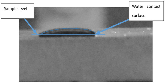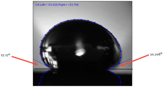 Figure 25 shows the best black silicon sample treated at α = 0.85 and 4 W. In this test, it was difficult to discern any distinct angle between the sample and the water surface, suggesting that this sample was hydrophilic. In contrast, Figure 26 illustrates a treated black silicon sample that exhibited a high level of hydrophobicity.
