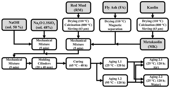 Aluminosilicates were obtained from washed kaolin, fly ash (FA), and red mud (RM). Torrecid (Içara, SC, Brazil) supplied the washed kaolin. FA originated at the Jorge Lacerda thermal power plant (Capivari de Baixo, SC, Brazil). RM was obtained from the Alunorte bauxite refinery (Barcarena, PA, Brazil). The alkali activator was made up of sodium hydroxide aqueous solution (50% w/w NaOH) and sodium silicate aqueous solution (15.1% w/w Na2O and 33.2% w/w SiO2) supplied by Oregon Química (Içara, SC, Brazil). FA was dried and subjected to a magnetic separation before use. Kaolin and RM were dried and calcined in an air atmosphere at 800 °C for 20 min at a heating rate of 10 °C/min [16,26].