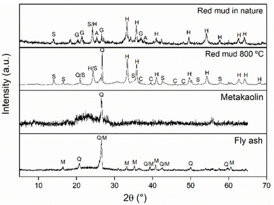 XRD diffractograms: fly ash; metakaolin; red mud calcined at 800 °C; uncalcined red mud. Q: quartz; M: mullite; C: calcite; H: hematite; S: sodalite; A: sodium aluminosilicate; G: gibbsite.
