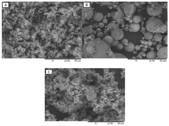 SEM morphology: (A) metakaolin; (B) fly ash; (C) red mud calcined at 800 °C.