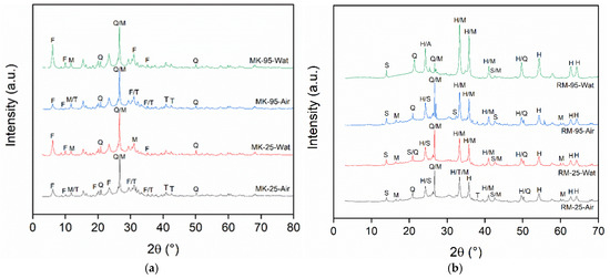 Figure 5 depicts the obtained XRD pattern for all geopolymer compositions and aging conditions. Geopolymers are amorphous structures that are primarily formed from aluminosilicate sources [33,34]. The crystalline phases found in geopolymers are typically leftover from the raw materials. This is true for quartz and mullite in all geopolymers. Figure 5b shows the hematite and sodalite in geopolymers derived from RM + FA. The presence of mullite, calcite, and zeolites in the geopolymers derived from MK and FA has also been reported in the literature [37].