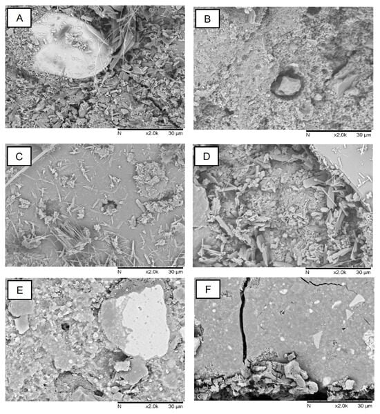 Figure 6 depicts the microstructure of the samples. The gel matrix formed by the geopolymer structure can be identified in all conditions. In each case, there are some unreacted particles as well. Geopolymers frequently correspond to this composite microstructure [35]. Unreacted particles are used as fillers and can provide some reinforcement [39].