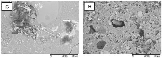 SEM morphology of geopolymers: (A) MK-25-Air; (B) MK-25-Wat; (C) MK-95-Air; (D) MK-95-Water; (E) RM-25-Air; (F) RM-25-Water; (G) RM-95-Air; (H) RM-95-Wat.