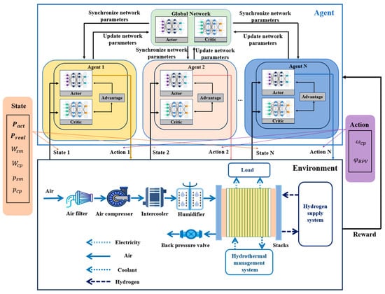 Reinforcement learning adjusts the control in real time by interacting with the environment and learning optimal decision paths [17,18,19]. In this study, an intelligent control strategy for PEMFC system’s AC and BPV based on the A3C algorithm is proposed, as shown in Figure 1. The A3C algorithm, leveraging its parallel computing capability, trains multiple agents asynchronously to accelerate learning, maintain policy diversity, and optimize control behavior. By progressively refining its policy, the intelligent body provides optimal control instructions for the PEMFC system, ensuring robust handling of high-dimensional tasks [20,21,22,23].