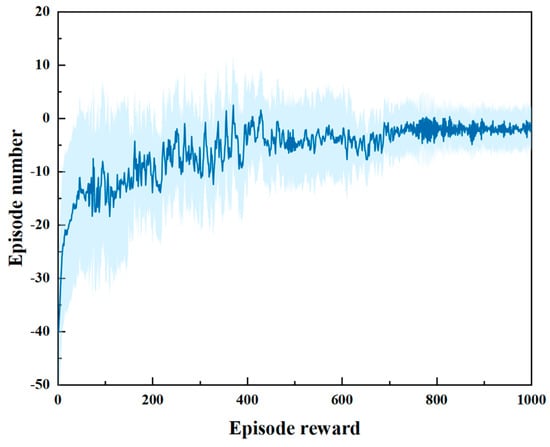 The A3C algorithm was implemented using Python (Matlab 2022b) on a workstation with an Intel Core i7-10750H CPU, 64 GB DDR4 RAM, and an NVIDIA GeForce GTX 1660 Ti GPU (Lenovo Rescuer, Beijing, China). Training for 1000 episodes took approximately 48 h. The asynchronous parallel mechanism of A3C enhanced computational efficiency by reducing the load compared to that of traditional single-threaded reinforcement learning algorithms, effectively handling high-dimensional tasks. Figure 2 illustrates the average cumulative reward trend during training. Initially, in the first 400 rounds, large fluctuations occur as the algorithm explores. After 400 rounds, the fluctuations decrease, and the average reward stabilizes after the 600th round, indicating that the A3C algorithm’s parameter settings and network structure are well-suited to support the learning process.