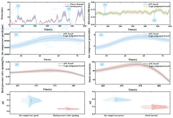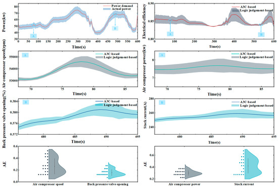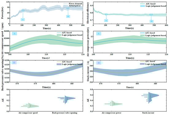 In accordance with test condition 1, the status of the air compressor and the back pressure valve, in addition to the dynamic response and efficiency of the PEMFC system under A3C-based control, are obtained and compared with those under logic judgement-based control. As illustrated in Figure 4, the A3C-based control exhibits a high degree of correlation between the PEMFC system’s power demand and the actual power, thereby effectively maintaining the stable operation of the PEMFC system. As can be observed in the enlarged figure, an increase in altitude results in the logic judgement-based control exhibiting a tendency to overshoot in terms of both the air compressor speed and the back pressure valve opening. In contrast, the A3C-based control is capable of generating commands for the air compressor speed and the back pressure valve opening in a relatively prompt manner, thereby facilitating a smooth and steady-state transition. Additionally, the air compressor power also increases rapidly, which ultimately leads to a reduction in the PEMFC system’s electrical efficiency. As the elevation is increased from 560 m to 600 m, the logic judgement-based control requires 1.3 s to reach a steady state, at which point the electrical efficiency of the PEMFC ssytem is 80.3%. In contrast, the A3C-based control reaches a steady state in a mere 0.8 s, with the electrical efficiency increasing to 83.8%. By comparing the two control methods, it can be observed that the A3C-based control significantly improves the dynamic response by 38.4%; in addition, its electrical efficiency is improved by 4.3%.