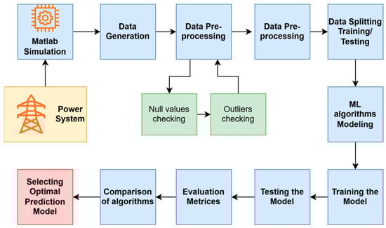Transmission line fault detection is essential for maintaining the reliability and stability of electrical power systems []. As modern power grids become increasingly complex and interconnected, traditional fault-detection methods face challenges in terms of accuracy, speed, and adaptability to changing grid conditions. In response, there is growing interest in leveraging machine learning (ML) techniques to enhance fault detection capabilities []. ML offers efficient pattern recognition algorithms that can be applied to predict, locate, and classify faults. These techniques solve non-linear problems based on learned experience and accommodate different configurations of electrical distribution systems [,,].