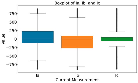 From Figure 4, it is evident that the current values contain potential outliers. However, before considering techniques, such as capping or winsorization for these outliers, an engineering perspective is essential. Outliers in this context correspond to fault conditions that inherently involve current values that are significantly higher than those in normal operating scenarios. Therefore, what are typically classified as outliers in standard datasets are the critical data points necessary for fault classification. Consequently, these data points should not be removed because they are crucial for accurately identifying and classifying fault types.
