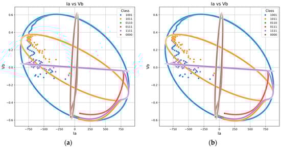 Scatter plots are effective tools for visualizing data relationships. In this context, the output labels [G, C, B, A] are collectively referred to as “class”, representing different fault classifications. Figure 5 displays the scatter plots of Ia versus Va and Ia versus Vb. These plots reveal noticeable symmetry in the dataset, forming elliptical shapes. The scattered points that deviate from these elliptical trajectories represent the transient states observed during the transitions from normal operation to short circuits or between different fault types.