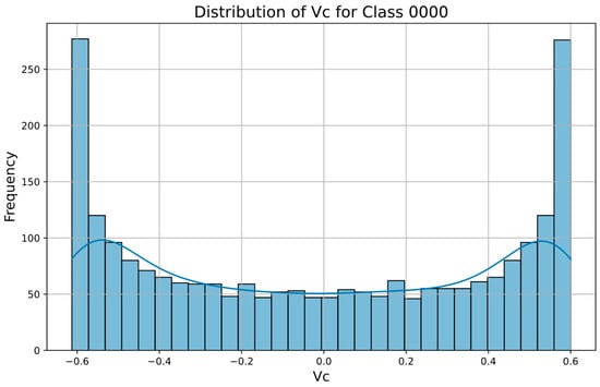 Another commonly used visualization method is histograms. Figure 6 presents the histogram distribution for phase Vc, specifically for cases classified as [0000], indicating non-faulted conditions. This histogram helps to illustrate the distribution and range of voltage values for the non-faulted state, providing insight into the typical variations in phase Vc when no faults are present.
