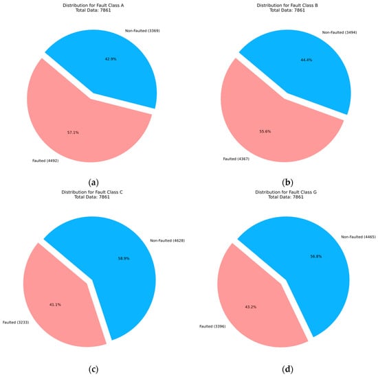 Pie chart for fault classification data size (a) for Class A, (b) for Class B, (c) for Class C, and (d) for Class G.