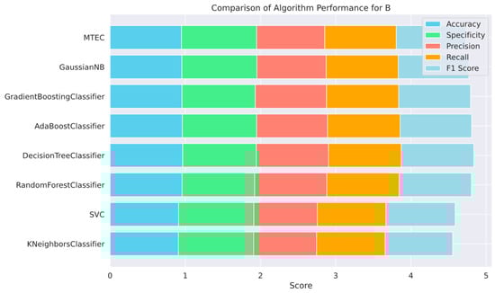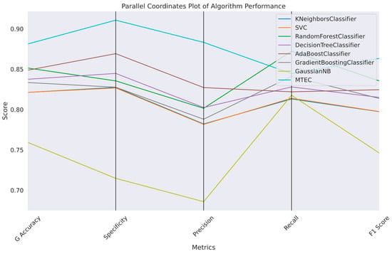 These metrics provide a comprehensive understanding of the model’s performance and address different aspects of prediction quality. Accuracy measures the overall accuracy of the model, whereas precision indicates the accuracy of positive predictions. Recall measures the model’s ability to identify positive cases, and the F1 Score balances the Precision and Recall, making it particularly useful for imbalanced class distributions. Specificity, on the other hand, assesses a model’s ability to correctly identify negative cases. By examining these metrics, we can effectively compare the performance of the basic ML algorithms with the proposed MTEC.