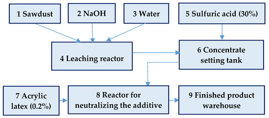 The main raw material used to produce the additive was wood processing waste in the form of sawdust from coniferous plants. Coniferous plants have the advantage of having a high lignin content between 25 and 50 per cent, whereas hardwoods have a lignin content between 15 and 25 per cent. The additive’s main component is the resulting lignin. To produce the MIA, softwood sawdust was placed in a reactor, and the leaching process began with heating to 90 °C for 8 h, after which the resulting concentrate was cooled naturally. Next, a maximum of 30% sulphuric acid was added to neutralise the obtained additive. After standing for 10 h, the additive was filtered to remove the solid sawdust and salt particles formed during neutralisation. Then, acrylic latex was added to the mixture at a concentration of 0.2% by weight of the mortar. This component promoted the bulk polymerisation of the cement stone, giving the aerated concrete hydrophobic properties. Figure 1 shows the additive production scheme.