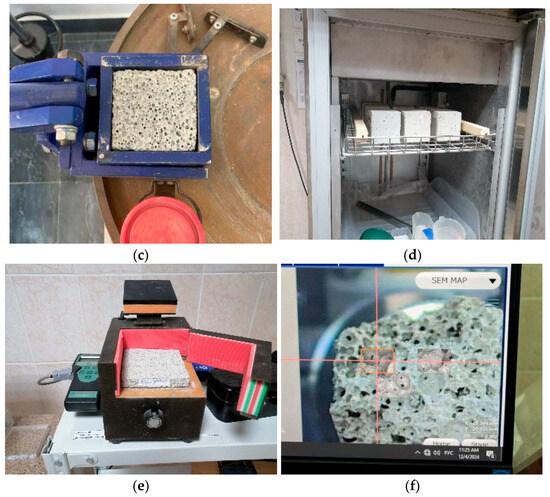 Laboratory testing complex: (a) compressive strength; (b) water absorption; (c) wear resistance; (d) frost resistance; (e) thermal resistance and conductivity; (f) X-ray diffraction analysis.