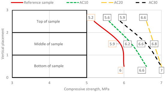 Figure 7 and Figure 8 show the frost resistance results of the samples, i.e., the indices of their strengths after cyclic freezing and thawing. Figure 7 shows the frost resistance results obtained in the lower locations of the compared specimen types, and Figure 8 and Figure 9 show those obtained in the middle and upper locations, respectively. Figure 10 shows the average strength loss of the specimens (regardless of location) as a percentage of the original strength.