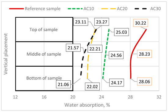 In the water absorption results, the maximum values were observed in the RS samples depending on the location, ranging from 28.06 to 30.22%, with an average of 28.84%. The minimum values were logically observed in the samples with the maximum content of the hydrophobising additive, that is, the AC30 samples, ranging from 21.06 to 23.27%, with an average value of 21.97%. It should be noted that the effectiveness of the additive decreased with an increase in its content in the aerated concrete composition, as the water absorption values of the AC20 samples did not differ much from those of the AC30 samples, ranging from 22.02 to 23.11%, with an average of 22.44%. The maximum effect (but not the maximum value) of the hydrophobising additive was observed at the initial introduction of the additive in the AC10 samples, ranging from 24.17 to 25.03%, with an average of 24.59%.