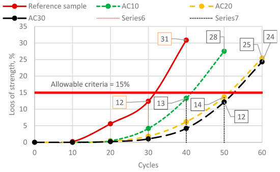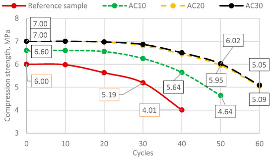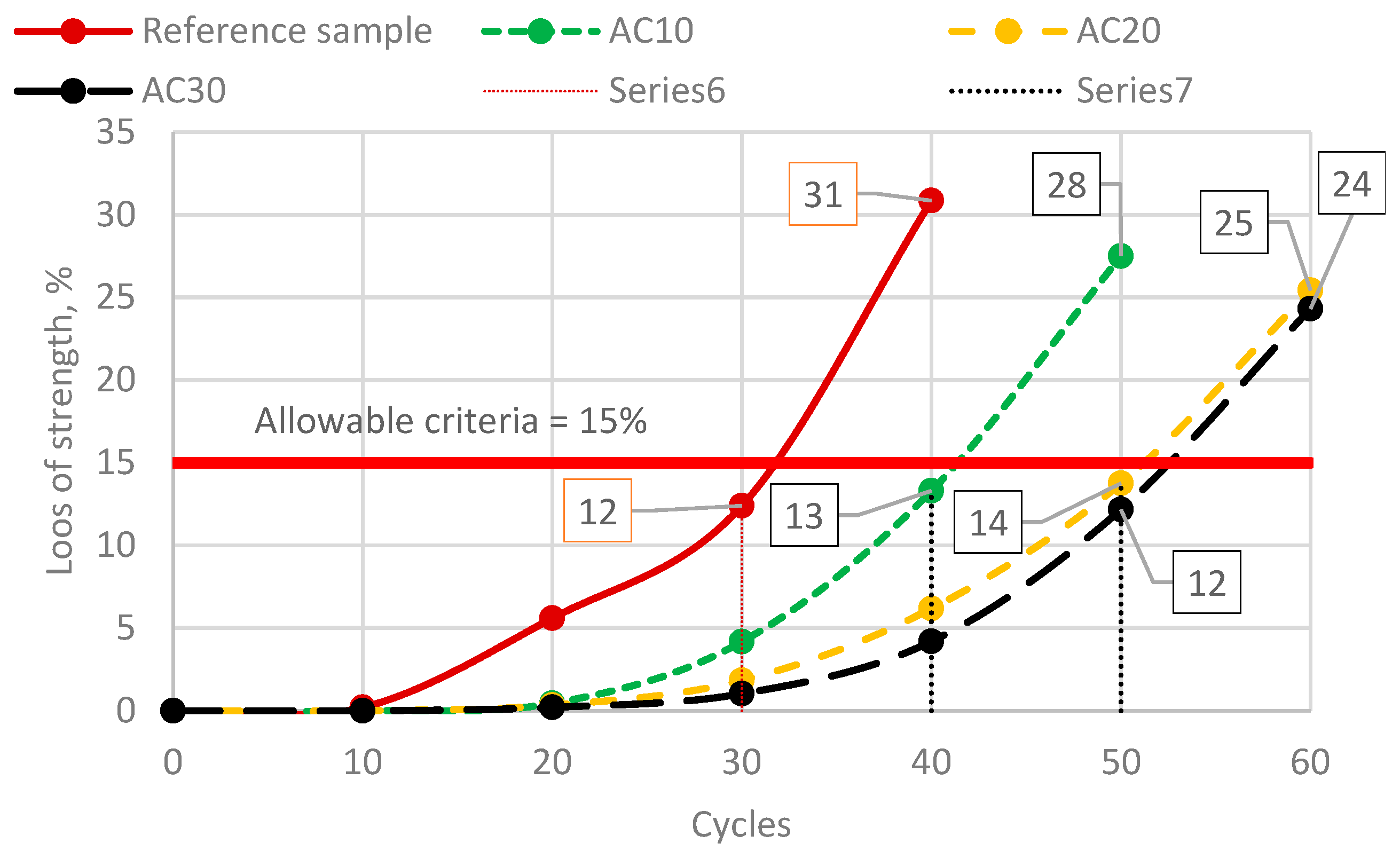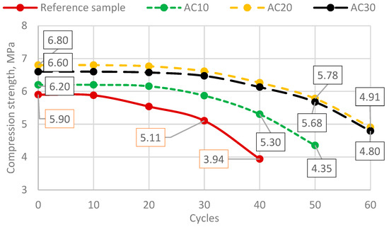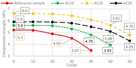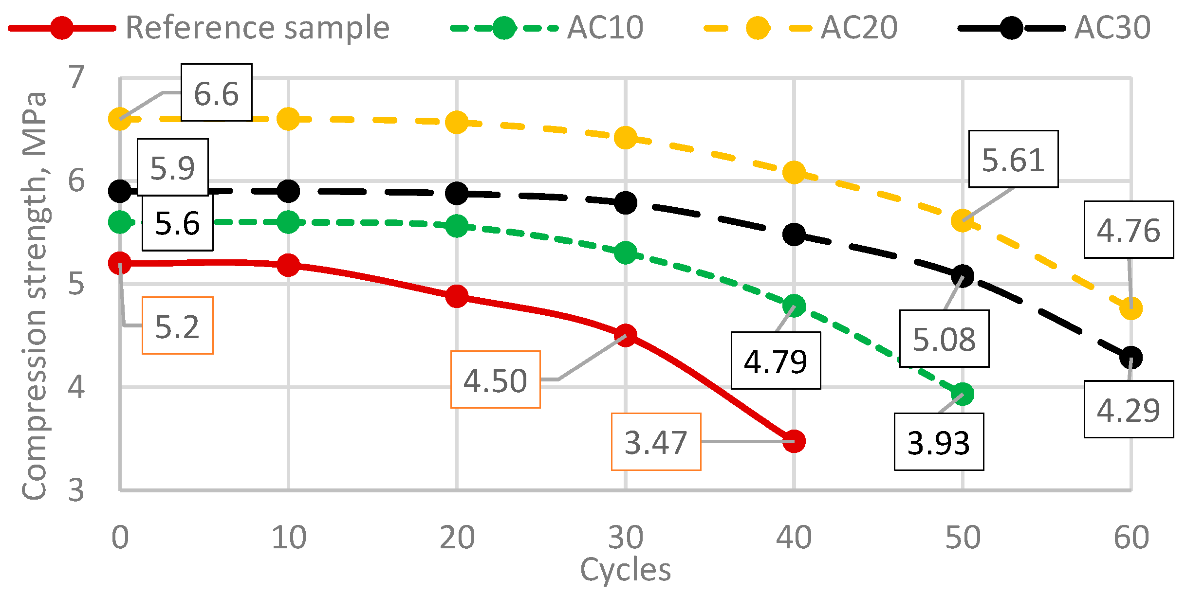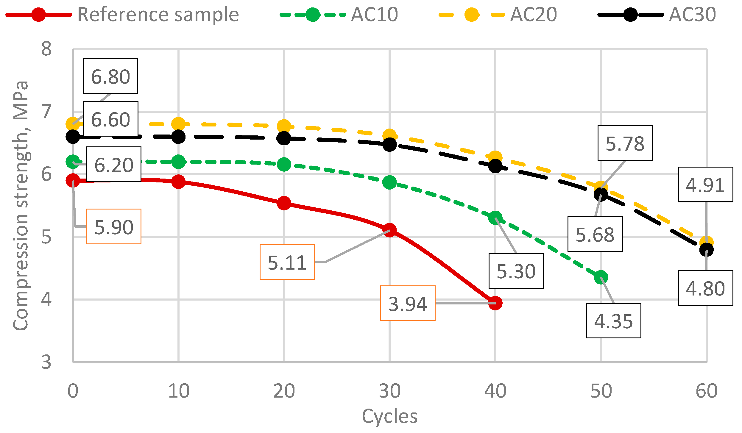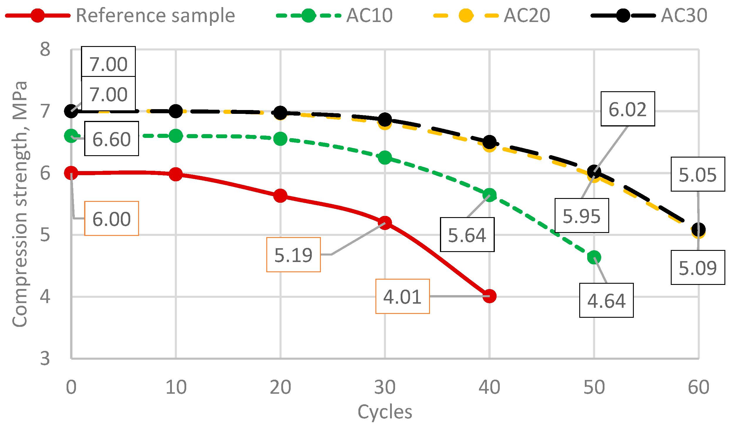 The results of the frost resistance tests showed that the RS specimens had the lowest resistance to cyclic temperature loading. The maximum number of freezing and thawing cycles, at which the limit of strength loss in the lower locations of the specimens (15% of the initial strength) was reached, was 40 cycles. Consequently, the residual strength at the permissible number of cycles (30 cycles) was 4.50 MPa. For the AC10 specimens, the residual strength was 4.79%, and the maximum number of allowable cycles was 40 cycles. For the AC20 and 30 samples, the permissible number of cycles was 50 cycles, corresponding to residual strengths of 5.61 and 5.08 MPa. In the middle and upper locations of the specimens, the number of allowable cycles was similar to that in the lower location as follows: RC, 30 cycles; AC10, 40 cycles; and AC20 and AC30, 50 cycles. The residual strength of the specimens in the middle location was as follows: RC, 5.11 MPa; AC10, 5.30 MPa; AC20, 5.68 MPa; and AC30, 5.78 MPa. The residual strength of the specimens in the upper location was as follows: RC, 5.19 MPa; AC10, 5.64 MPa; AC20, 5.95 MPa; and AC30, 6.02 MPa. Thus, the RC samples were classified as F30, the AC10 samples were classified as F40, and the AC20 and AC30 samples were classified as F50. The coefficients of variation increased with an increasing number of freezing and thawing cycles: in the initial cycles (up to 20 cycles), they did not exceed 10%, and in the final cycles, they exceeded 20%. Nevertheless, the maximum variation in the data of the final cycles was observed in the RC samples, with a coefficient of variation of 32%, and the minimum variation was observed in the AC30 samples, with a coefficient of variation of 21%.