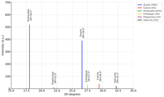 - An X-ray diffraction analysis revealed a reduction in the portlandite content from 52% to 31%, as well as an increase in the calcite and hatrurite fractions. This indicates lower internal stresses and the formation of a denser, more homogeneous cement matrix.